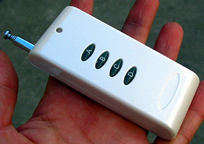 上图为发射器外形,面板上有A、B、C、D四位操纵按键及一个发射指示灯。因为要满足远距离遥控,所以发射机的发射功率比较大,当然发射电流也比普通的遥控模块大许多,市场上常见的200米遥控模块的发射电流一般在10毫安左右,而这种800米发射机的发射电流,当天线不拉出时约20毫安,遥控距离在300米左右,当天线全部拉出时发射电流增大到60毫安,遥控距离在开阔地大于800米。
