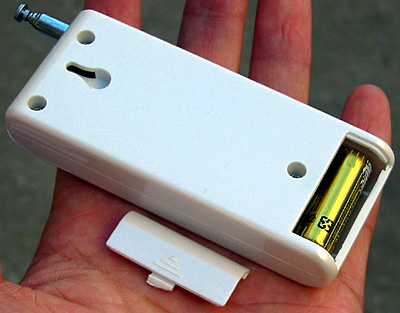 发射器体积体积32x17x85毫米,带有23厘米长的金属拉杆天线,使用A27电池供电,背后有活动的电池舱盖,可以方便地更换电池。