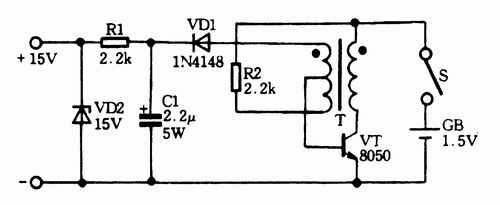 如图所示是一种构造很简单的小型直流升压器,可用来取代15V的叠层电池。电路的核心元件一变压器T使用的是袖珍验钞器的专用变压器。电路耗电约40mA,输出电压为15V。如果万用表15V电池的正极与1.5V电池的负极相接,只需将图7—70中VD1(C1、VDZ的极性调过来,这样将输出一个-15V电压。