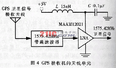 可见,GPS接收机中各级单元电路的内部噪声对级联后总噪声系数的响应有所不同,级数越靠前的单元电路的噪声系数对总噪声系数的影响越大。因此,总噪声系数主要取决于最前面几级单元电路的噪声系数,其中天线热噪声对接收机性能影响最大,故设计时采用接收天线、射频频段选择带通滤波器及高频低噪放(LNA)等器件组成天线单元(如图4所示)。天线单元采用DC5V供电,其中LNA采用高增益、低噪声、高频放大器MAAM12021,其增益高达21dB、噪声系数低于1.55dB,有利于降低GPS接收机的总噪声系数;其工作频段处于1.5~1.6GHz,适合于C/A码GPS接收机的频带需求,可满足高增益和低噪声系数的性能指标要求