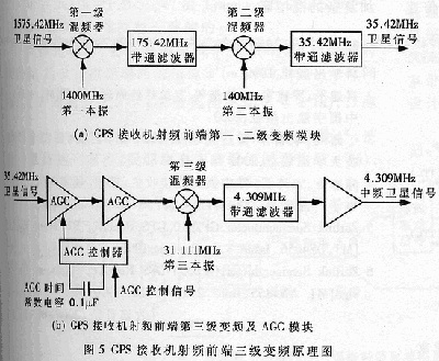 噪声总线伴随着信号同时出现,尽可能提高噪声背景下输出端的信噪比是改善接收机灵敏度的重要措施。GPS接收机天线单元接收并提供给射频单元的信号频率很高而信道带宽又很窄,要直接滤出所需信道,则需Q值非常大的滤波器,至少目前的技术水平难以满足这一指标;另外高频电路在增益、精度和稳定性等方面的问题,在高频范围直接对GPS卫星信号进行解调很不现实。为此,在射频单元设计中采用“超外差”式多级变频配合区配滤波器的电路结构,以消除噪声干扰,解决高频信号处理中所遇到的困难。适合这种电路结构的芯片采用了第二代GPS接收机射频前端GP2010。它采用44引脚、帧面方形封装,主要集成了频率合成器、混频器、自动增益控制(AGC)电路以及数字量化器等。GP2010接收的信号频率与L1载波的卫星信号频率兼容,主要用于设计C/A码GPS接收机的射频单元。微弱的GPS高频信号通过超外差式三级混频电路,去掉了其它信道干扰,获得了足够增益,解调并撮出所需的中频信息。图5给出了前两级超外差式下变频器和带有自动增益控制(AGC)电路的第三级混频器的工作原理图,每经过一次下变频,输出信号的频率降低、幅度增大,而其它信道和频段的干扰则被逐步滤除。