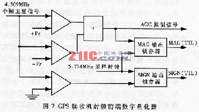 为配合通道单元和解算单元完成导航信号的数据提取及信号处理,在5.714MHz采样时钟控制下,GP2010的片内集成数字量化器可实现对4.309MHz的中频卫星信号进行数字量化,从而为通道单元相关器提供TTL电平的2位量化输出,即1.405MHz的二进制符号及量值数字信息,如图7所示。为了得到平稳的中频卫星信号及采样数字输出,该模块同时产生AGC控制信号用于稳定第三级变频(如图5(b)所示)时所产生的中频信号幅度。