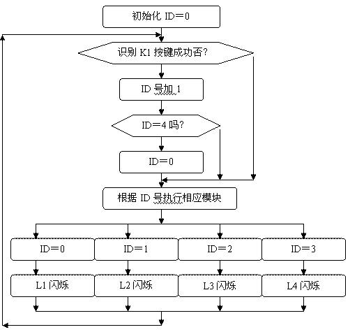 从上面的要求我们可以看出,L1到L4发光二极管在每个时刻的闪烁的时间是受开关SP1来控制,我们给L1到L4闪烁的时段定义出不同的ID号,当L1在闪烁时,ID=0;当L2在闪烁时,ID=1;当L3在闪烁时,ID=2;当L4在闪烁时,ID=3;很显然,只要每次按下开关K1时,分别给出不同的ID号我们就能够完成上面的任务了。下面给出有关程序设计的框图。