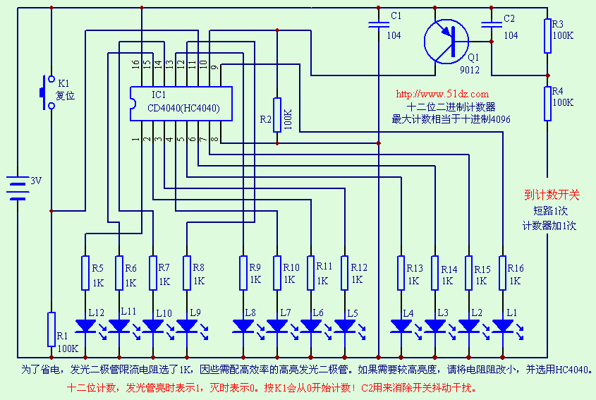采用CD4040IC带动12支超亮发光二极管,发光二极管的亮灭代表着不同的数字。