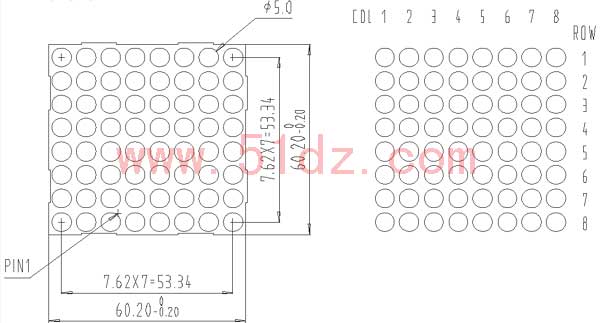 黄绿色点阵共阴,全新8×8,发光尺寸:Φ5mm,发光颜色:单色,黄绿色,透明,表面黑色。总点数:64,表面大小 :60.2×60.2×9.2(mm),双列16脚,位距:2.54mm。