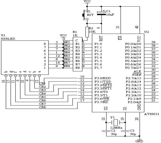 送第一列线代码到P3端口,同时置第一行线为“0”,其它行线为“1”,延时2ms左右,送第二列线代码到P3端口,同时置第二行线为“0”,其它行线为“1”,延时2ms左右,如此下去,直到送完最后一列代码,又从头开始送。