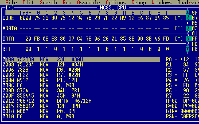 内存中值的变化在此是看不到的,可以用如下方法观察(看图5):将鼠标移到DATA,双击,则光标进入此行,此时可以键盘上的上下光标键上下翻动来观察内存值的变化。本行的最前面DATA后面的数据代表的是“一段”的开始地址,如现在为20H,再看屏幕的最上方,数字从0F,显示两者相加就等于真正的地址值,如现在图上所示的内存20H21H22H23H中的值分别是FBH 0EHE8H30H