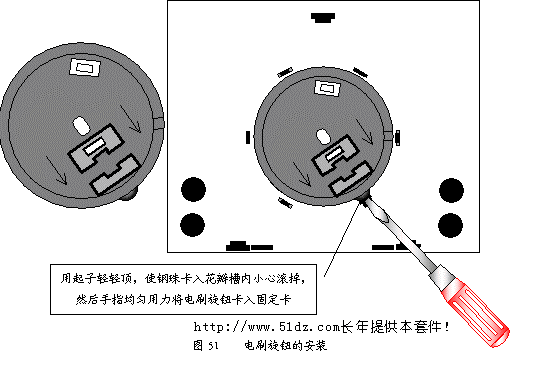 将电刷旋钮平放在面板上(见图51),注意电刷放置的方向。用起子轻轻顶,使钢珠卡入花瓣槽内,小心滚掉,然后手指均匀用力将电刷旋钮卡入固定卡。