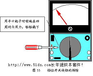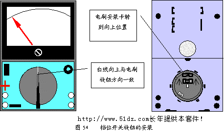 电刷旋钮安装正确后,将它转到电刷安装卡向上位置(见图54),将档位开关旋钮白线向上套在正面电刷旋钮的小手柄上,向下压紧即可。