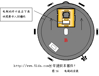 刷接触点上面2个相距较远,下面2个相距较近,一定不能放错(见图56)。电刷四周都要卡入电刷安装槽内,用手轻轻按,看是否有弹性并能自动复位。