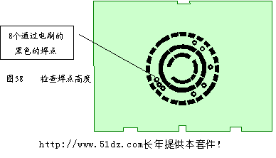 安装线路板前先应检查线路板焊点的质量及高度,特别是在外侧两圈轨道中的焊点(见图58),由于电刷要从中通过,安装前一定要检查焊点高度,不能超过2mm,直径不能太大,如果焊点太高会影响电刷的正常转动甚至刮断电刷。